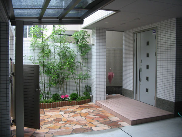 玄関の一部に木庭を設置。見た目のさわやかなエントランスを演出しました。
