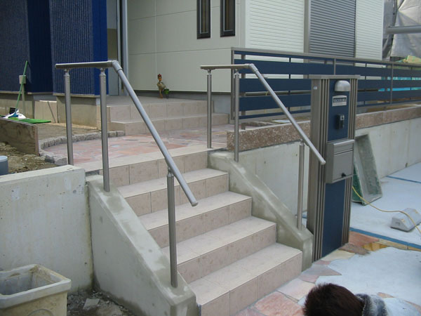 入口周りをしっとりとしたタイル貼りで落ち着いた雰囲気を演出。手摺りも設置し、安全対策もバッチリです。