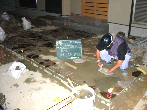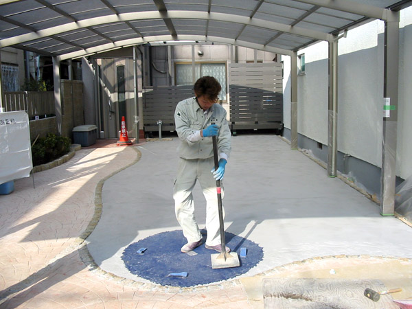 普通のコンクリートの上に色付け薬剤を塗布、マットを上に載せて叩き模様を刻印。美しい模様を土間を作ります。